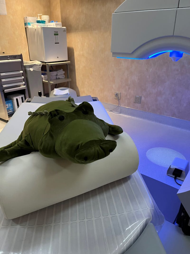 The team will meet you in the laser suite, where there are 2 lasers. First, you will lie down on the bed. Your nurse will offer you something to hold for comfort, either a plush toy or a basketball. Then, they will clean your eyelids and give you the first set of numbing drops.